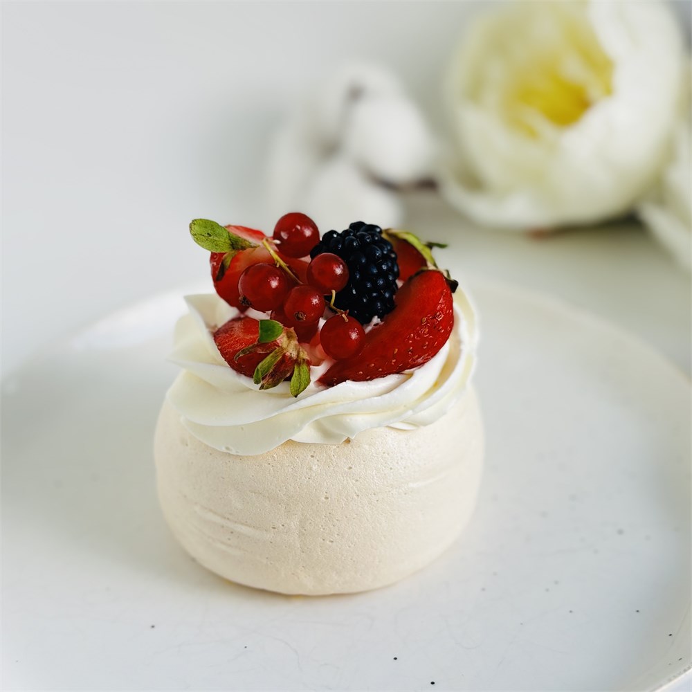 Воздушное хрустящее безе, сливочный ванильный крем с маскарпоне и крем-чизом, сезонные ягоды.